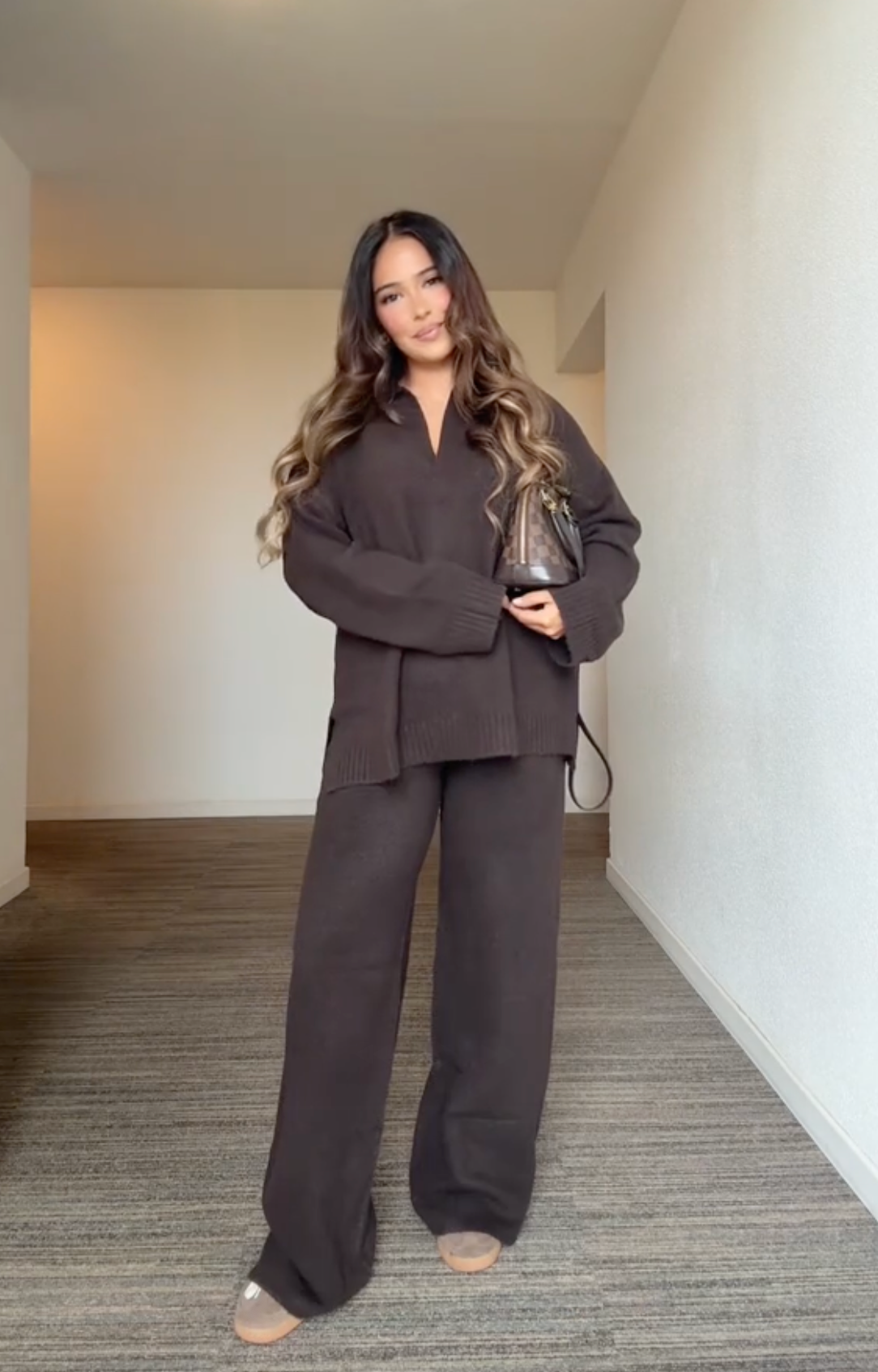 Schlüpfen Sie in gemütliche Eleganz mit dem HALLEY Luxe Strickset in dunklem Schokoladenbraun – dem perfekten Zweiteiler für mühelose Eleganz zu Hause oder unterwegs. Das lässige, lange Strickoberteil mit offenem V-Ausschnitt und schmeichelnden Seitenschlitzen, kombiniert mit einer weiten Hose für eine nahtlose Silhouette, ist Ihr neues Must-have für Komfort ohne Kompromisse.