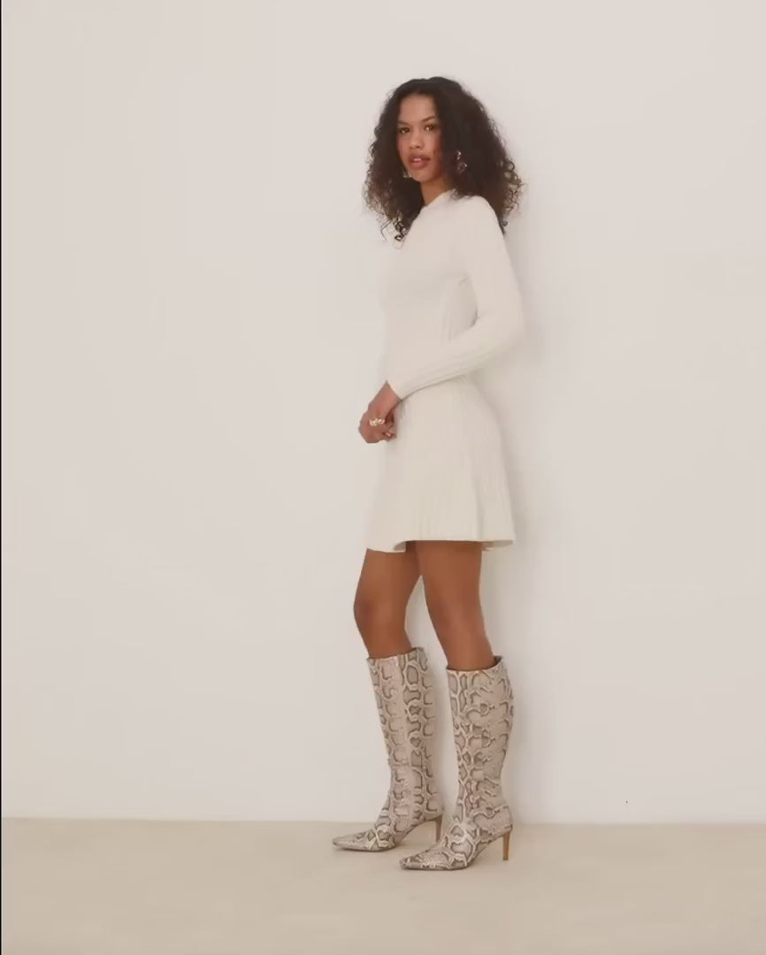 Mini length pairs perfectly with knee-high boots