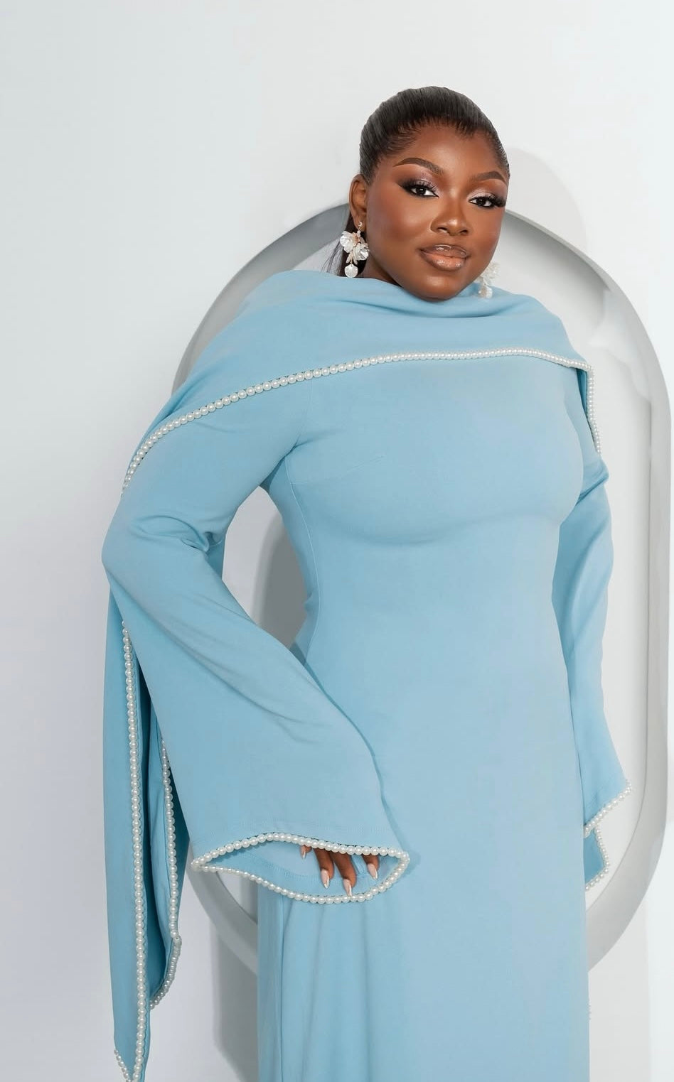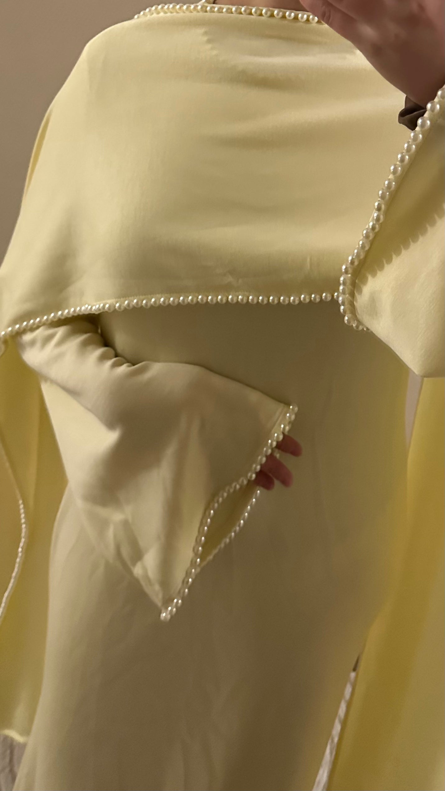 - Hand-applied pearl details on scarf & sleeves