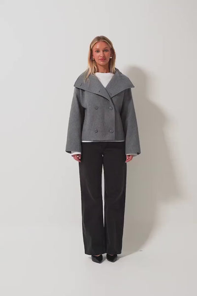 The NELLY Short Double-Breasted Coat redefines classic tailoring with a modern, minimalist touch. Featuring a structured wide collar, double-breasted front, and fluid long sleeves, it combines timeless elegance with everyday versatility. Its slightly loose, cropped silhouette makes it perfect for layering over knitwear or sleek trousers for a chic, effortless look.